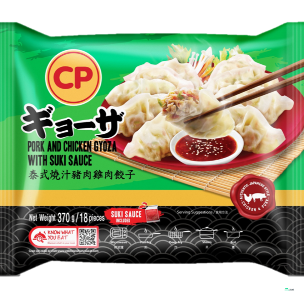 Savory CP Pork and Chicken Gyoza, served with a flavorful Suki Sauce. Ideal for appetizers or snacks, these gyoza feature a delicious blend of pork and chicken, complemented by a tangy and slightly sweet Suki sauce.