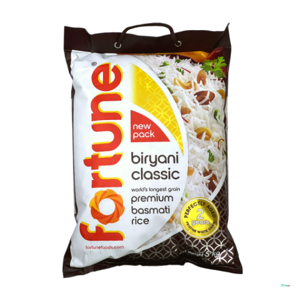 High-quality Fortune Biryani Classic Premium Basmati Rice, 5KG. Renowned for its extra-long grains, rich aroma, and exquisite taste, this basmati rice is perfect for preparing authentic biryanis and other gourmet dishes. Ideal for restaurants and home cooks seeking premium ingredients.