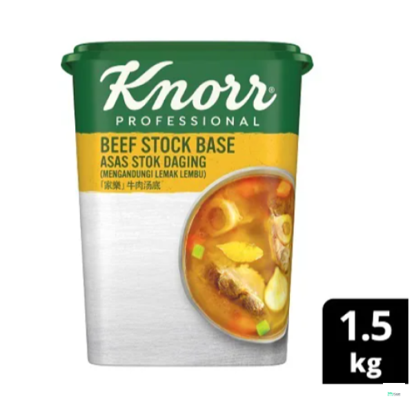 Knorr Beef Stock Base in a 1.5-kilogram container, providing a rich and robust beef flavor. Ideal for soups, stews, sauces, and gravies, this stock base offers consistent quality and taste, perfect for both professional kitchens and home cooking.