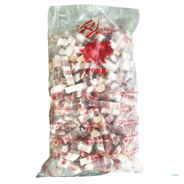 UOM: PKT 5kgx4pkt/ctn Premium pork belly cubes with skin, cut to 1.5cm, featuring layers of meat, fat, and skin. Ideal for dishes requiring tender, flavorful pork with a crispy texture.