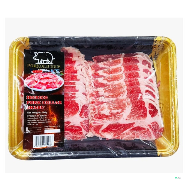 UOM: PKT 200gx20pkt/ctn Ultra-thin slices of Iberico pork collar, cut to 1.8-2mm, perfect for shabu-shabu or sukiyaki. This cut is celebrated for its tender, well-marbled meat, providing a melt-in-your-mouth experience with minimal cooking.